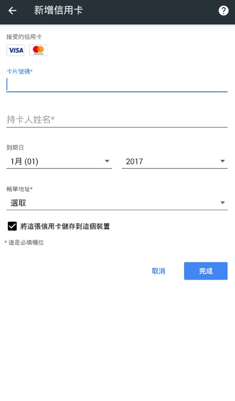 例如說刷卡的時候只要刷過一次,就可以讓 Chrome 把這一張的卡的資訊記在瀏覽器裡面,下次再到別的網站刷卡時,你只要點一下輸入卡號的輸入框,Chrome 就會提示你說可以用之前的那張卡來付費。